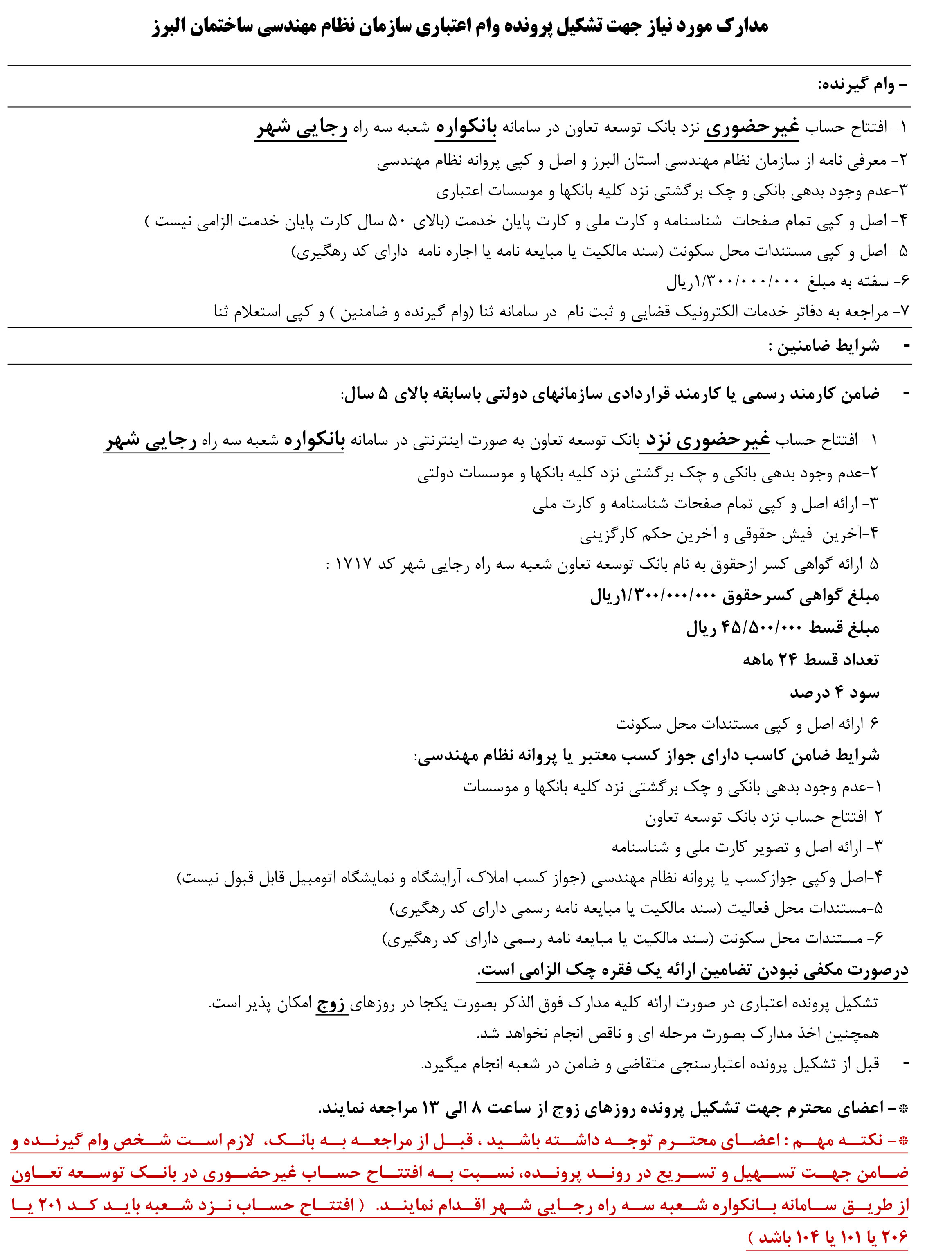 *- نکته مهم : اعضای محترم توجه داشته باشید ، قبل از مراجعه به بانک، لازم است شخص وام گیرنده و ضامن جهت تسهیل و تسریع در روند پرونده، در صورت نداشتن حساب فعال، نسبت به افتتاح حساب غیرحضوری در بانک توسعه تعاون از طریق سامانه بانکواره شعبه سه راه رجایی شهر اقدام نمایند.